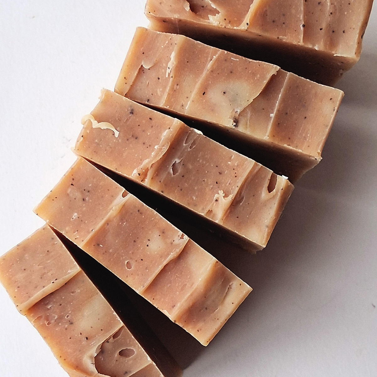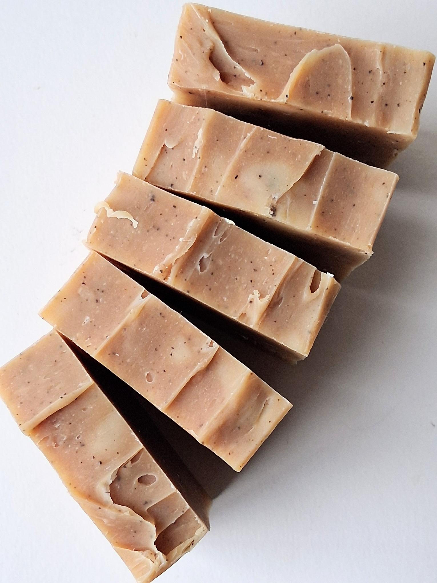 A Spicy, bubbly and creamy tallow soap with coffee grinds for exfoliation